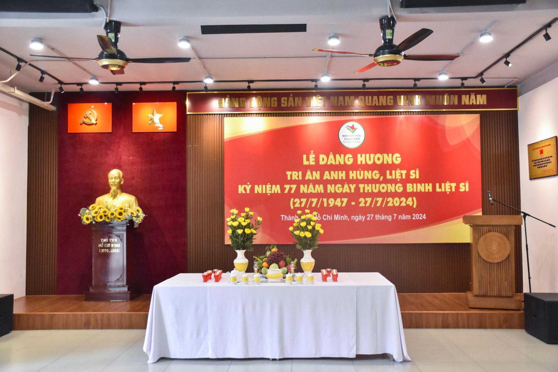 Nhân kỷ niệm 77 năm Ngày Thương binh - Liệt sĩ (27/7/1947 - 27/7/2024), tập thể cán bộ, viên chức, người lao động Nhà Văn hóa Thanh niên đã tham gia công tác tổ chức "Lễ thắp nến tri ân tại Nghĩa trang Liệt sĩ Thành phố Hồ Chí Minh" và tổ chức "Lễ dâng hương tưởng niệm các anh hùng Liệt sĩ tại phòng Truyền thống Đoàn TNCS Hồ Chí Minh" nhằm tưởng nhớ công lao to lớn của các anh hùng dân tộc.