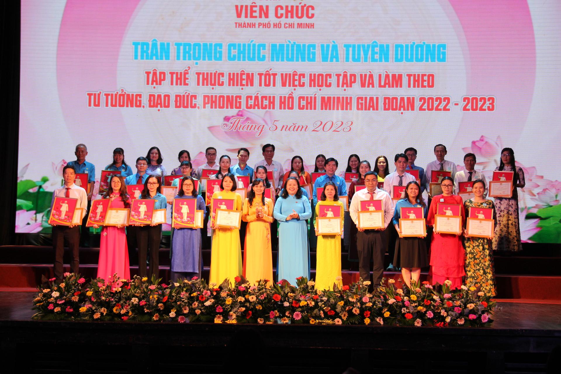 Cũng nhân dịp này, Công đoàn Viên chức TP tuyên dương 43 tập thể, cá nhân thực hiện tốt việc học tập và làm theo tư tưởng, đạo đức, phong cách Hồ Chí Minh; 47 gương “Lao động giỏi, Lao động sáng tạo” và 22 gương “Người tốt - Việc tốt” năm 2023. Nhà Văn hoá Thanh niên vinh dự được đón nhận danh hiệu "Tập thể thực hiện tốt việc học tập và làm theo tư tưởng, đạo đức, phong cách Hồ Chí Minh giai đoạn 2022 - 2023"
