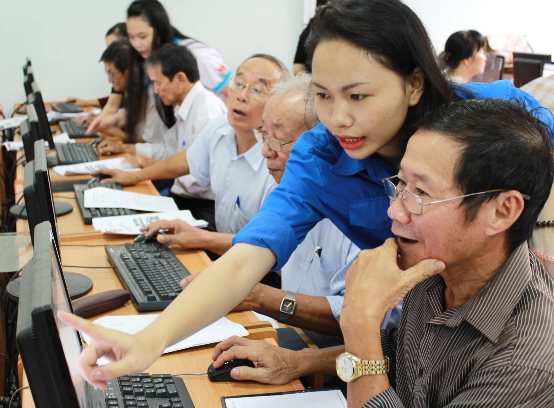 Các bạn trẻ hỗ trợ người lớn tuổi làm quen với tin học, công nghệ, mạng Internet - Ảnh: Q.L.